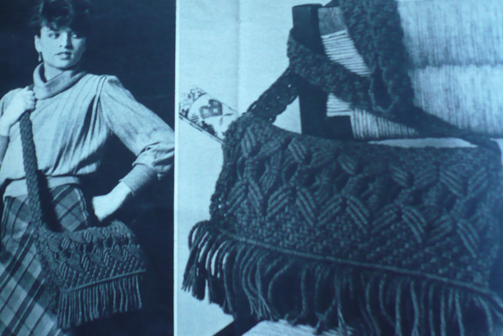 A munka menete: 34,egyenként 5 m-es,és egy 1.5m-es szálat vágunk.Az utóbbira felhúrkoljuk a szokásos módon félbehajtva a többi szálat.A két oldalt megmaradó vendégszállal fogjuk a táska oldalát összedolgozni.A hurkolás alatt kb:85 cm hosszú vendégszálra 3 duplahuroksort készítünk.A vendégszálak végeit a munka viszáján horgolótű segítségével a huroksorokba húzzuk.Ezután váltott laposcsomókkal haladunk tovább,50-52 cm hosszú részt készítve.Most munkánk két szélén 4-4 szálat elhagyunk,és a következő 12-12 szálból alakítjuk ki a pillangómintát oly módon,hogy csoportonként először 3,2,1 laposcsomót csomózunk egymás alatt,és csak azután kezdjük a pillangómintát a már leírtak szerint.Összesen ötöt készítünk.A munka két szélén levő 4-4 szálból váltóhurkokat, ,,farkasfogat" készítünk 2-2 szál felhasználásával,tehát mindkét oldalon 2-2 oszlopunk lesz.Ezeket a pillangóminta huroksorainak megfelelő hosszban hurkoljuk,majd a négy szálat laposcsomóval összefogjuk.A 4 szállhoz hozzávesszük az első,illetve az utolsó pillangóminta 4-4 szálát,és laposcsomóval összefogjuk őket úgy,mint a minták közötti szálakat.Alattuk ismét farkasfog-oszlopok következnek.A pillangóminta-sor alatt a sorcsomókból alakult háromszögeket váltott laposcsomókkal töltjük ki.A háromszög csúcsába 1,alája 2,majd 3 csomó kerül.Még ké sor váltott laposcsomó-sort csomózunk,és vendégszálra készített duplahuroksorral zárjuk a munkát,alatta 8-10 cm hosszú rojtot hagyva.